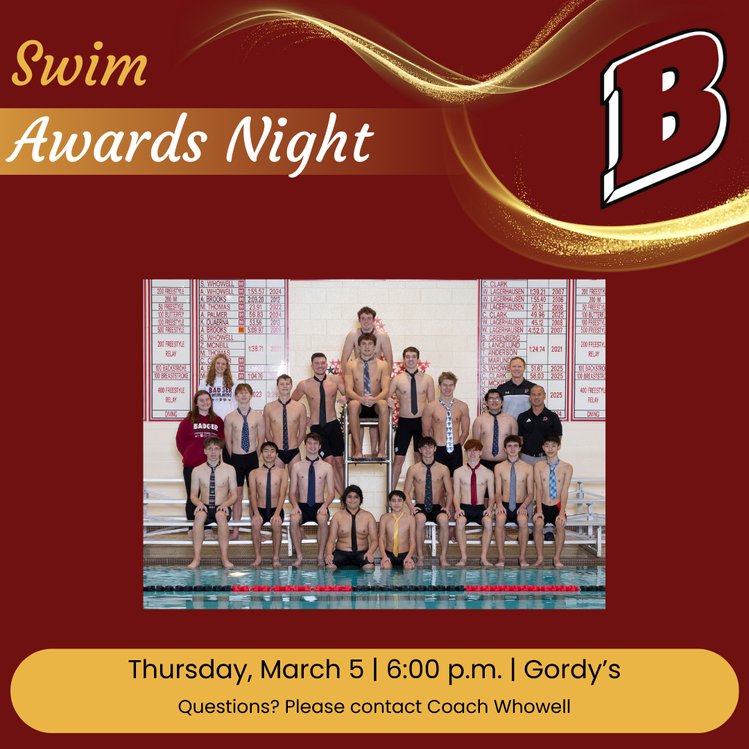 | 6:00pm- 8:00pm | Swim [B] Awards | Gordy's (Information) | |